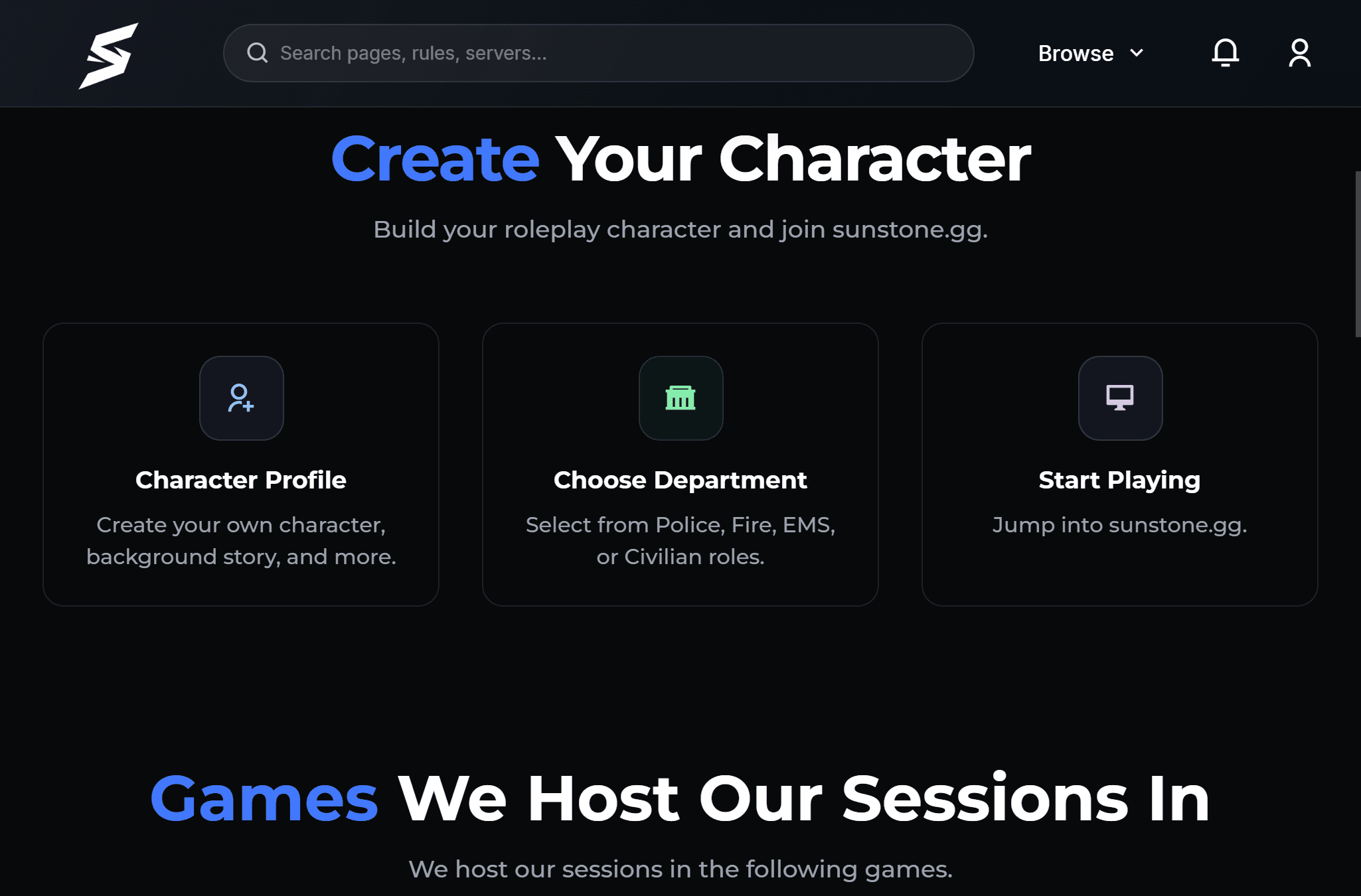 sunstone.gg is a roleplaying community based in 3 games, this includes ER:LC, Maple County & Berkeley County. I tasked myself with making a interactive, user-friendly website that showcases the point of the website, the community, and how to join.